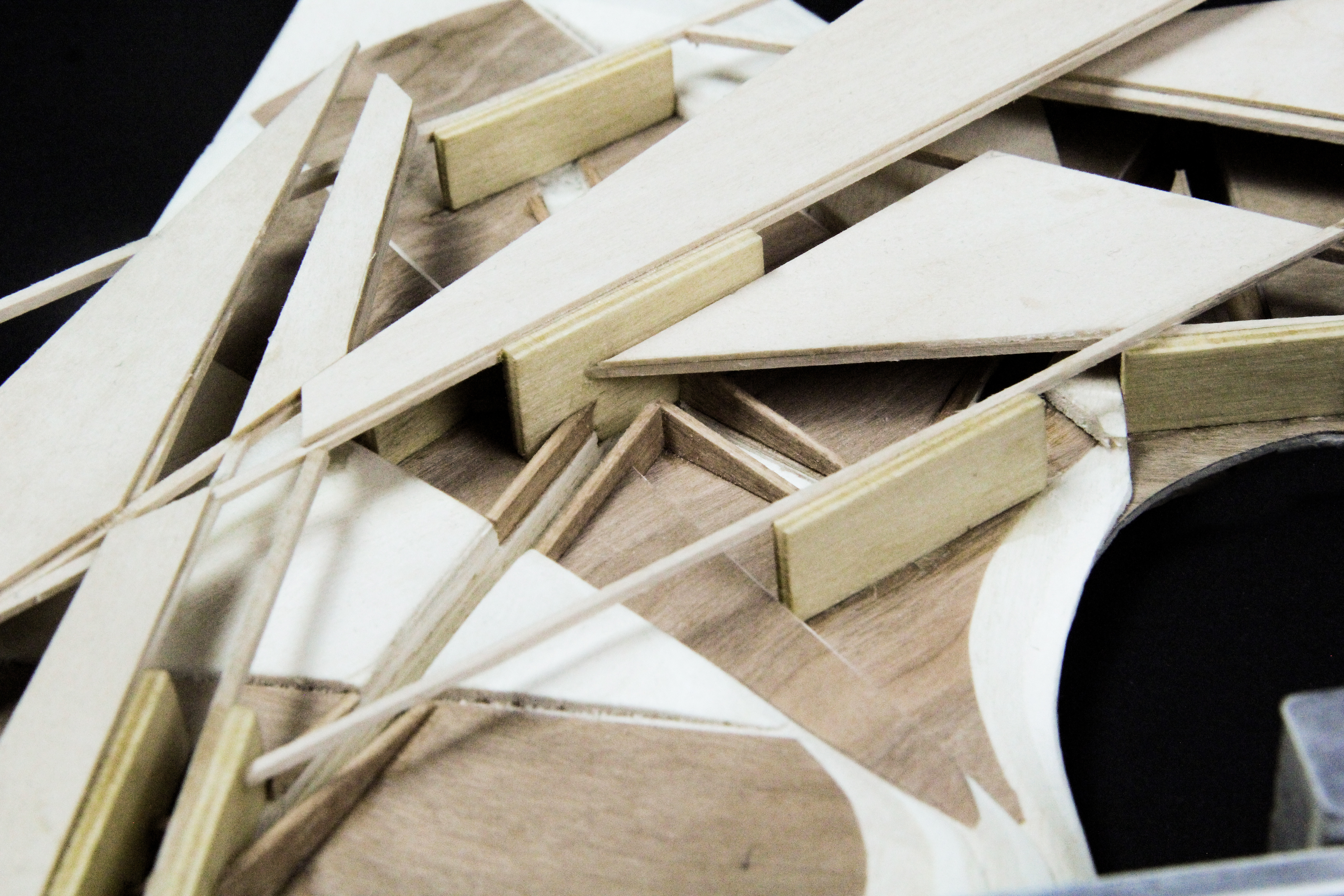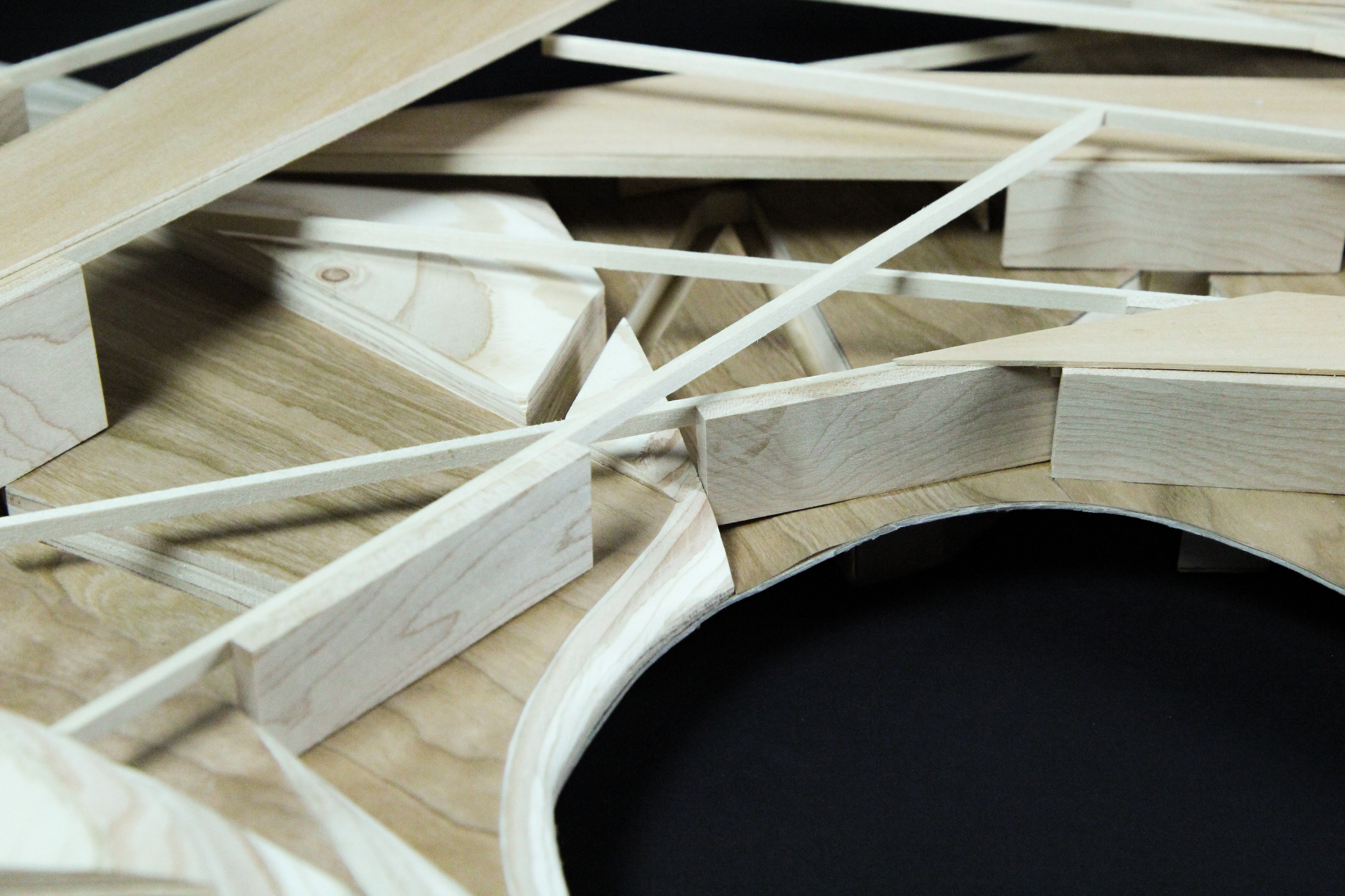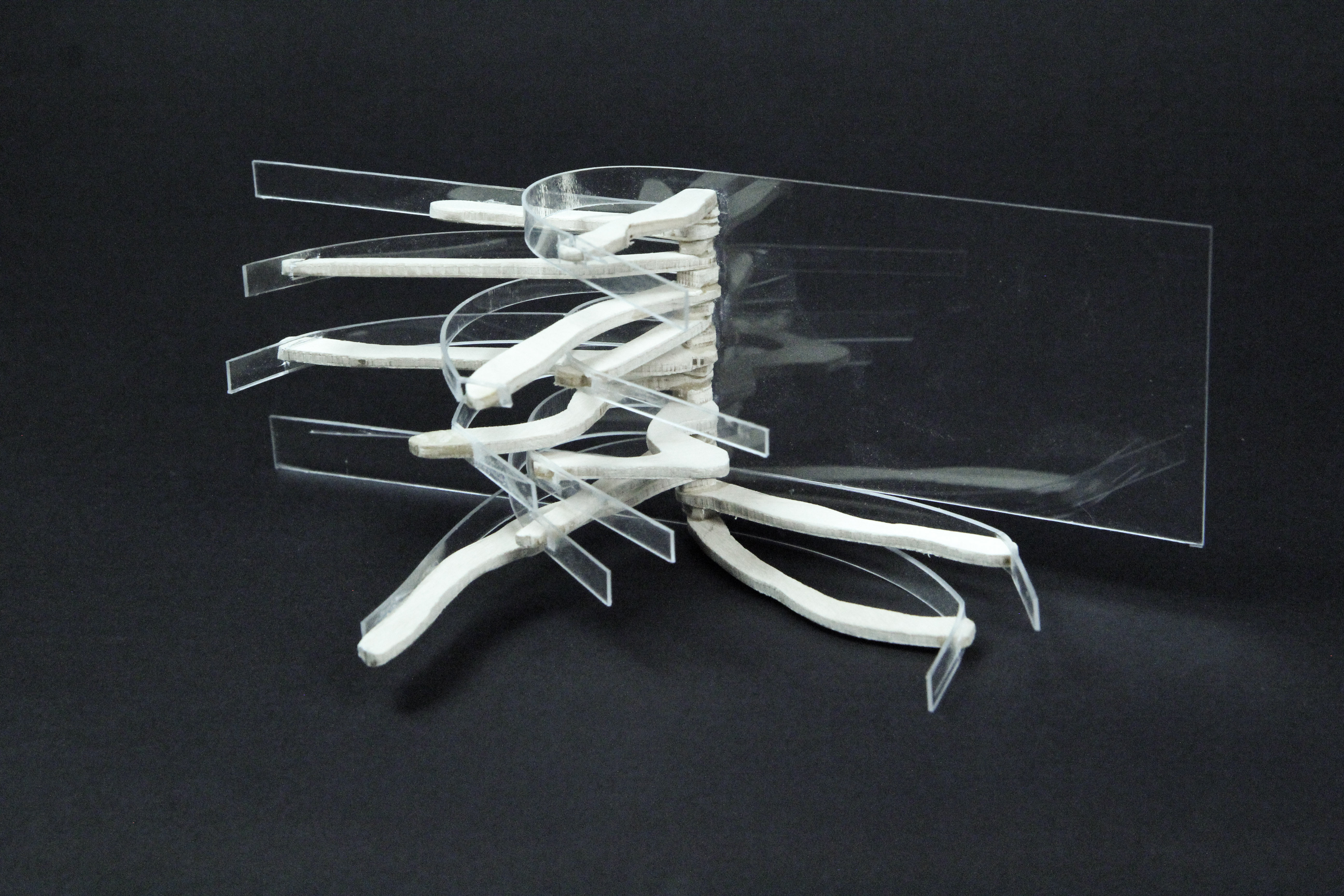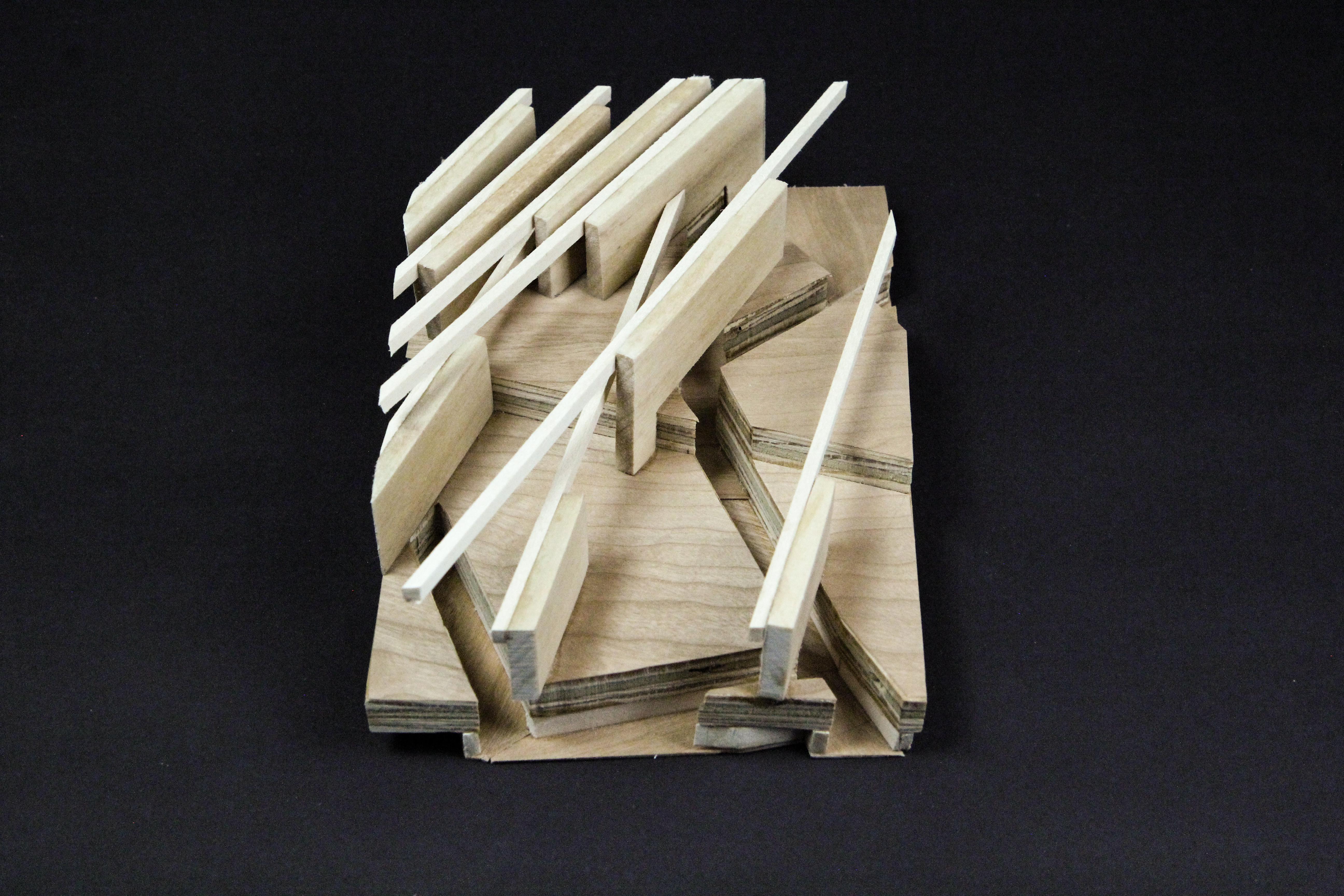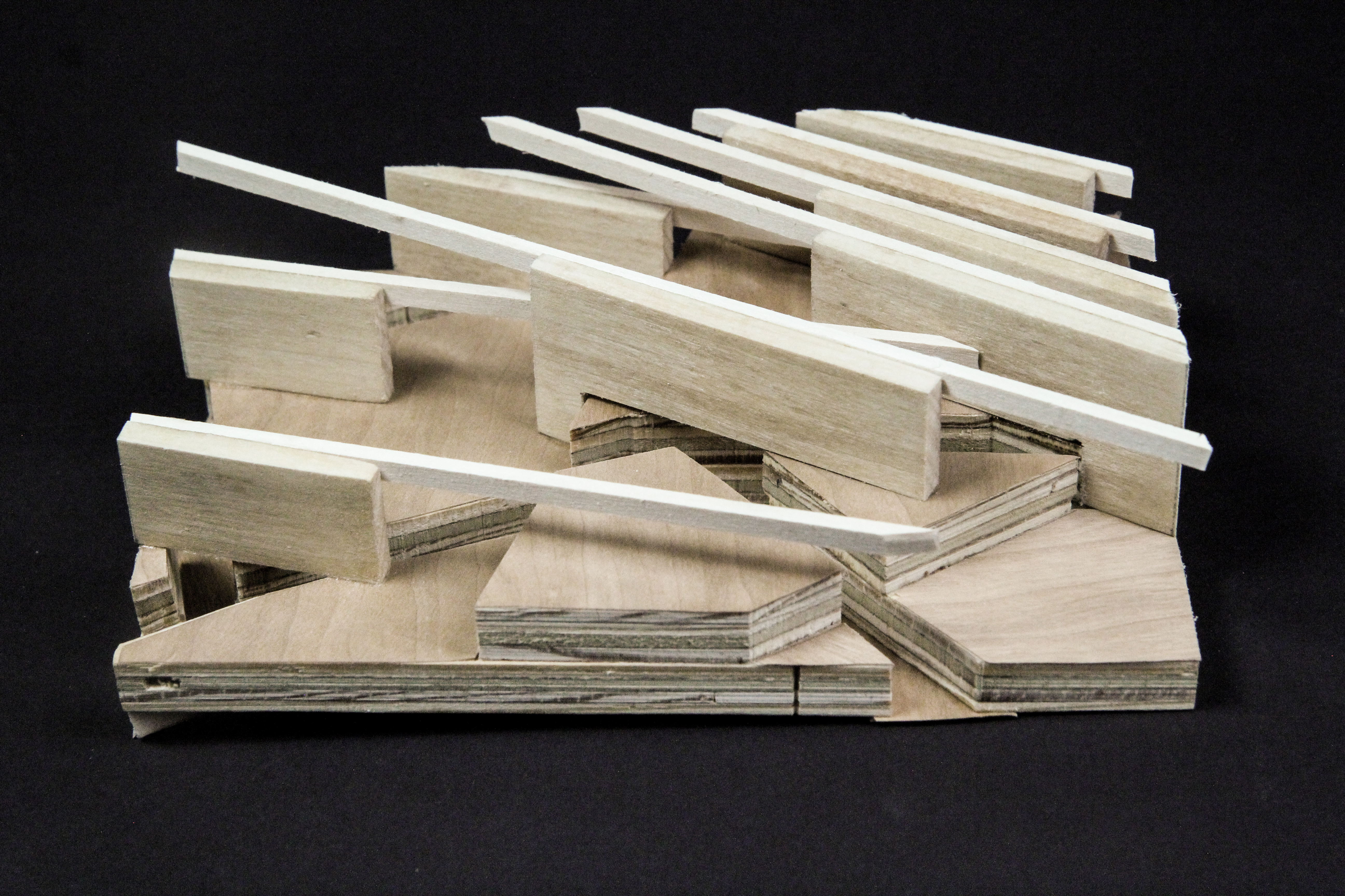 When overlaid on top of one another, the full alphabet formed by the drawing machine displays a varying range of densities. This informs the leveling pattern of the topography as well as the placement of the spatial dividers in the structure. The shape of the walls and beams are inspired by the main structure of the drawing machine as it creates each individual letter. Pathways connect neighboring wall structures, thereby linking all layered platforms in an organized circulatory system. The density of the canopy defines a spectrum for public and private spaces to occupy.